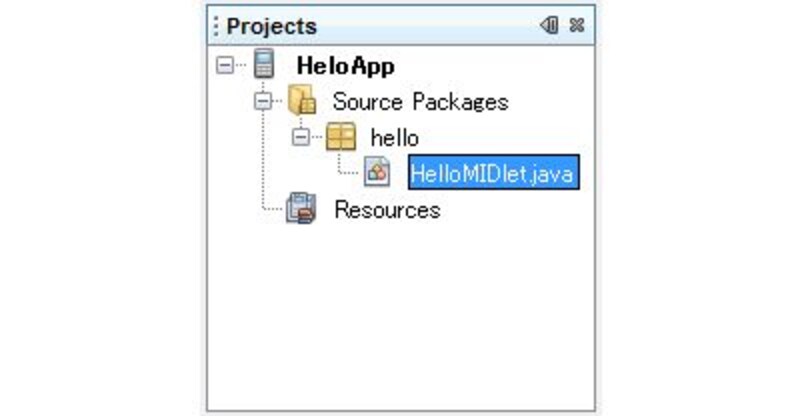 デフォルトでは、「hello」というパッケージに「HeloMIDlet.java」というソースコードファイルが作成されます。初期状態で、ごく簡単なソースコードが書かれているはずです。これは、単純なテキストを画面に表示するだけのシンプルなサンプルコードです。これをもとにして、それぞれでソースコードを書き換えて作りましょう、というわけです。