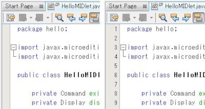 | 行番号を表示すると、エディタの表示がこのように変わる。 |