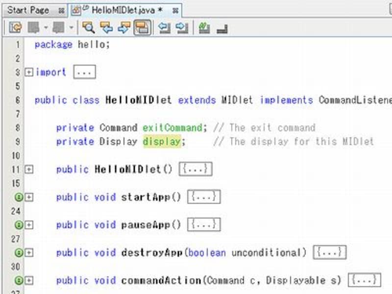 では、今回からいよいよプログラミングを始めることにしましょう。前回、「HeloApp」というプロジェクトをサンプルに作ってみましたが、このとき、HelloMIDlet.javaというソースコードファイルも自動的に作成されていました。このソースコードがどのようなものか、ざっと見てみましょう。
