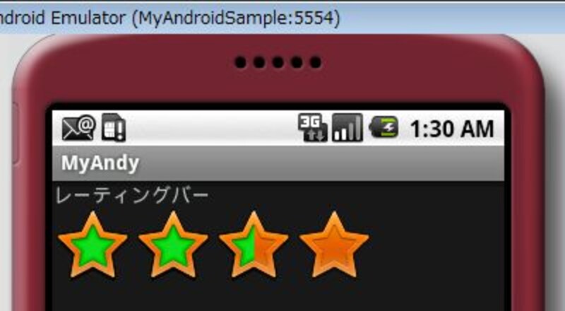 このレーティングバーを使うとき、注意しておきたいのは「android:layout_width="wrap_content"に設定する」という点です。wrap_contentではなく、fill_parentにしてしまうと、numStarsの値に関係なく右端まで★が表示されてしまいます。