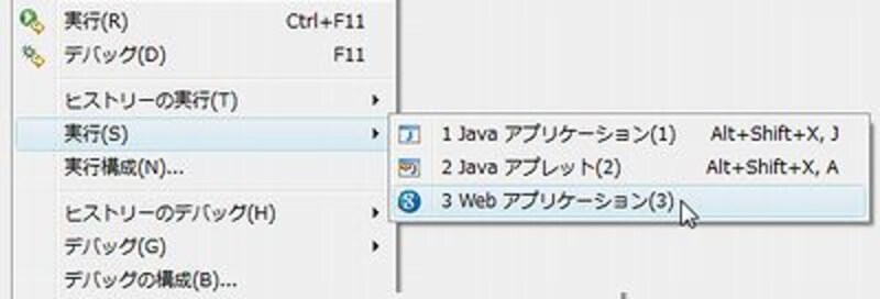 | <実行>メニューから<Webアプリケーション>を選ぶ。 |