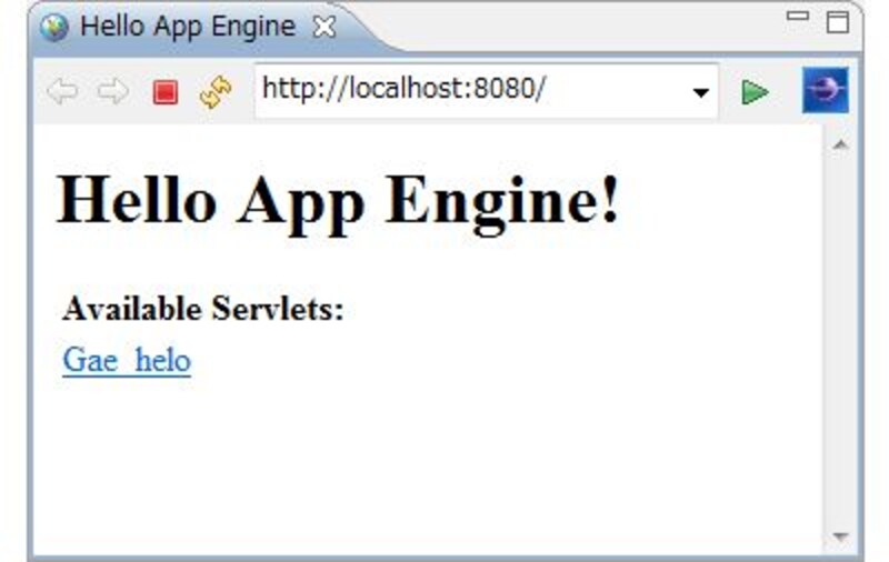 実行すると、GAEに内蔵されているWebサーバー(Jetty)が起動し、これによりプロジェクトのWebアプリケーションが実行されます。http://localhost:8080/にアクセスしてみましょう。作成したアプリケーションが表示されます。