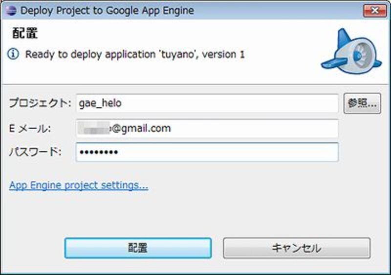 作成したプロジェクトを、実際にGAEのサイトにデプロイするには、ツールバーにある「Deploy App Engine Projectのアイコンをクリックして行います。クリックすると、配置のためのダイアログが現れるので、ここでプロジェクト、GAEサイトのアカウントとして登録してあるGmailのメールアドレスとパスワードをそれぞれ入力し、配置します。これで、プロジェクトをビルドし、プロジェクトに指定されているアプリケーションにデプロイを行います。