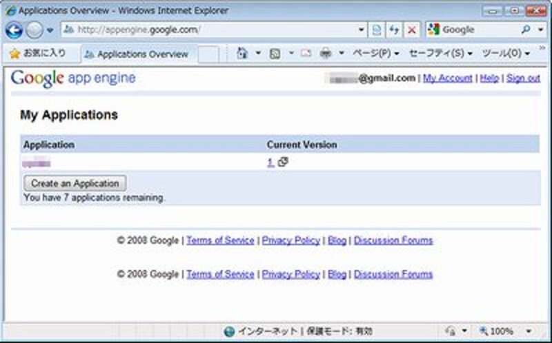 GAEのサイトにいき、「My Applicattions」ページ(http://appengine.google.com/)で確認をしてみると、アップロードしたアプリケーション名のCurrent Version)に、プロジェクトで指定したバージョン番号が表示されているはずです。このバージョン番号をクリックすると、アプリケーションのサイトにジャンプします。