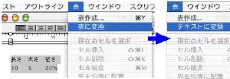 - 表 - 表に変換 ・・・・ タブ区切りテキストをまとめて選択して実行すると、表ができあがります。できあがった表をまたテキストに戻せるので、便利です。また、表内の文字の配置などもわりと自由にできたりするので、“ちょっとした表”を作成するのような場合にとても便利です。