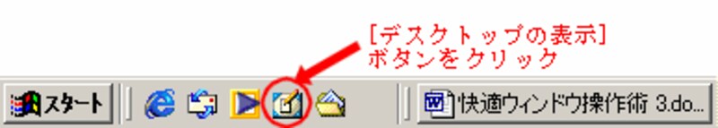 ウィンドウをたくさん開いている状態で、デスクトップにあるアイコンを操作したくなった時、この操作を知っていると便利です。[クィック起動]ツールバーにある[デスクトップの表示]ボタンをクリックすると、すべてのウィンドウが最小化されます。もう一度クリックすると、元の状態に戻ります。