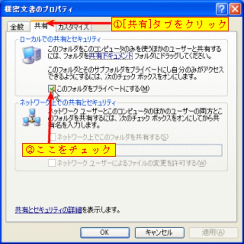 ダイアログボックスが表示されたら、[共有]タブをクリックしてから、[このフォルダをプライベートにする]をチェックします。