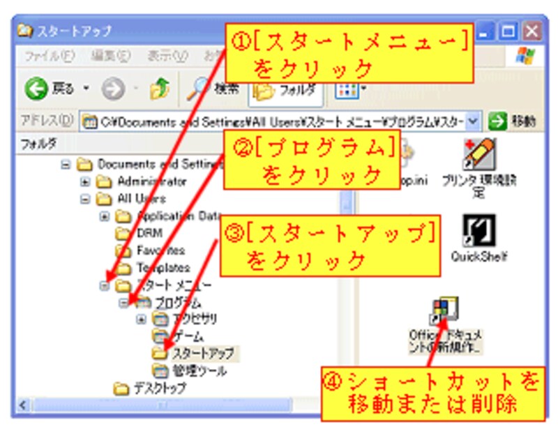 Windows起動時に自動実行されるプログラムには、[スタートアップ]フォルダにショートカットとして登録されているものと、レジストリや環境設定ファイル(Win.ini)に直接指定されているものがあります。まず、[スタートアップ]フォルダに登録されているショートカットの削除方法を説明します。