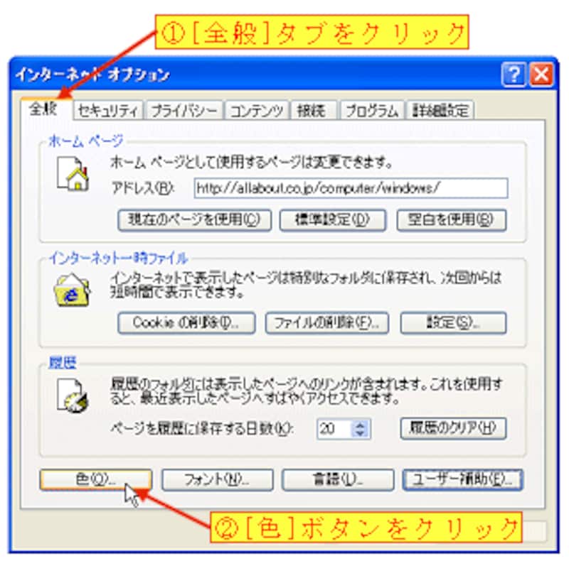 [インターネットオプション]ダイアログボックスが表示されたら、[全般]タブにある[色]ボタンをクリックします。