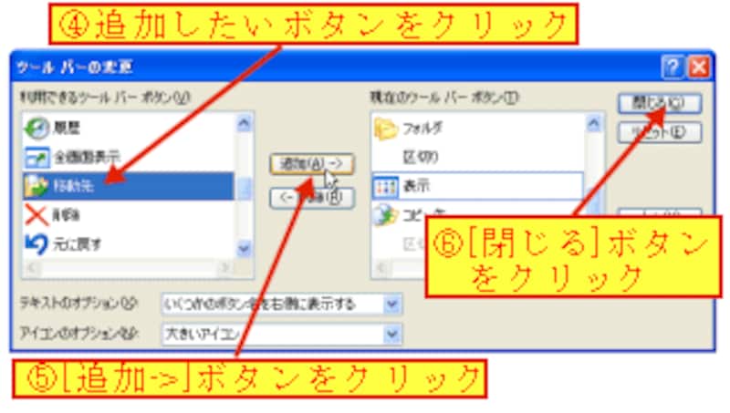 [ユーザー設定]をクリックすると、[ツールバーの変更]ダイアログボックスが表示されます。左側のボックスから追加したいボタンを選択し、[追加->]ボタンをクリックします。ボタンの位置を変更したいときは、[上へ]ボタンはたは[下へ]ボタンをクリックします。