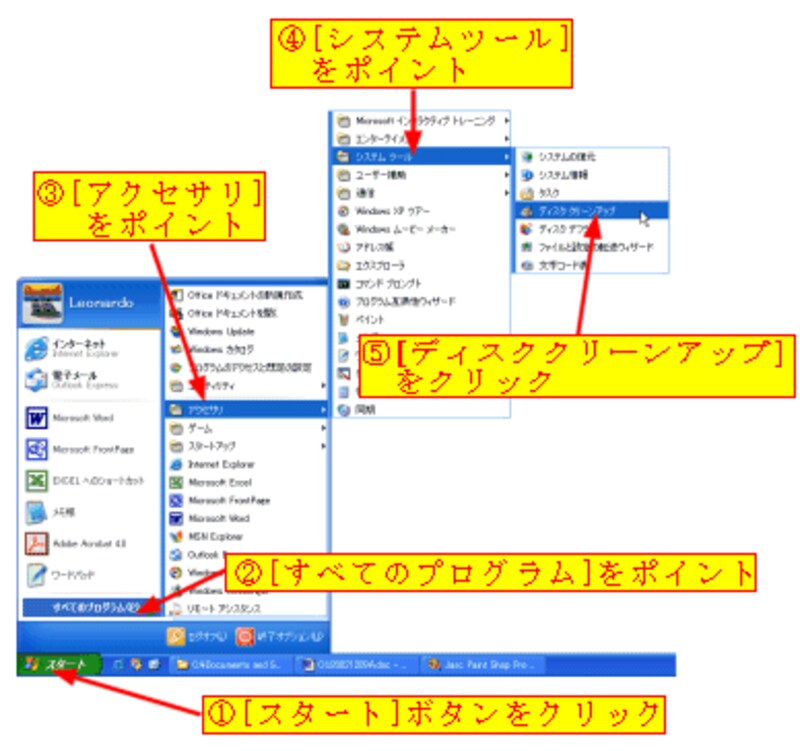 まず、[スタート]メニュー→[すべてのプログラム]→[アクセサリ]→[システムツール]→[ディスククリーンアップ]を選択します。