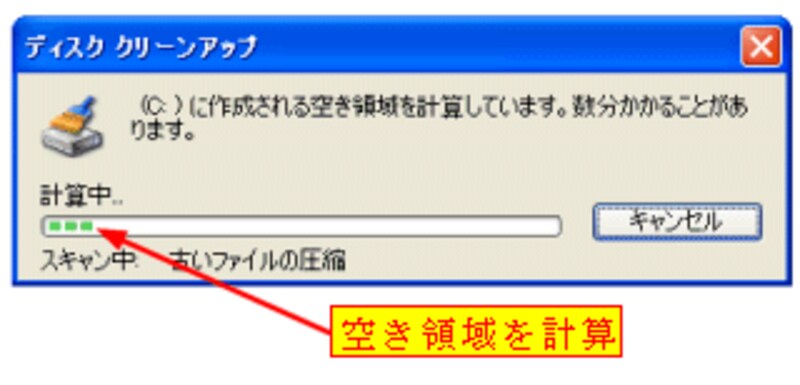 [ディスククリーンアップ]ツールが起動すると、ハードディスクに作成される空き領域を計算します。計算に数分かかることがあります。