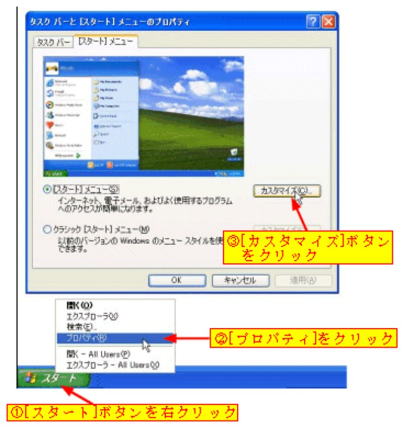 [スタート]メニューのカスタマイズは、ほとんど[[スタート]メニューのカスタマイズ]ダイアログボックスで行います。このダイアログボックス開くには、[スタート]ボタンを右クリック→[プロパティ]→[カスタマイズ]ボタンをクリックします。