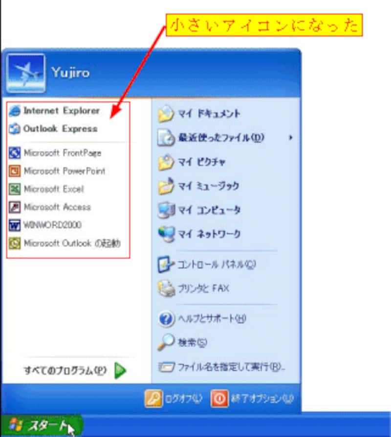 アイコンを小さくすると、[追加された項目一覧]と[よく使うプログラム一覧]にたくさんのプログラムを表示できるようになります。[スタート]ボタンを右クリック→[プロパティ]→[カスタマイズ]ボタン→[小さいアイコン]をオンにします。