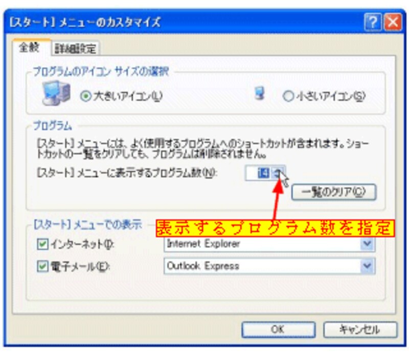 [よく使うプログラム一覧]の表示数を0から30まで範囲で指定できます。[スタート]ボタンを右クリック→[プロパティ]→[カスタマイズ]ボタン→[[スタート]メニューに表示するプログラム数]ボックスで指定します。