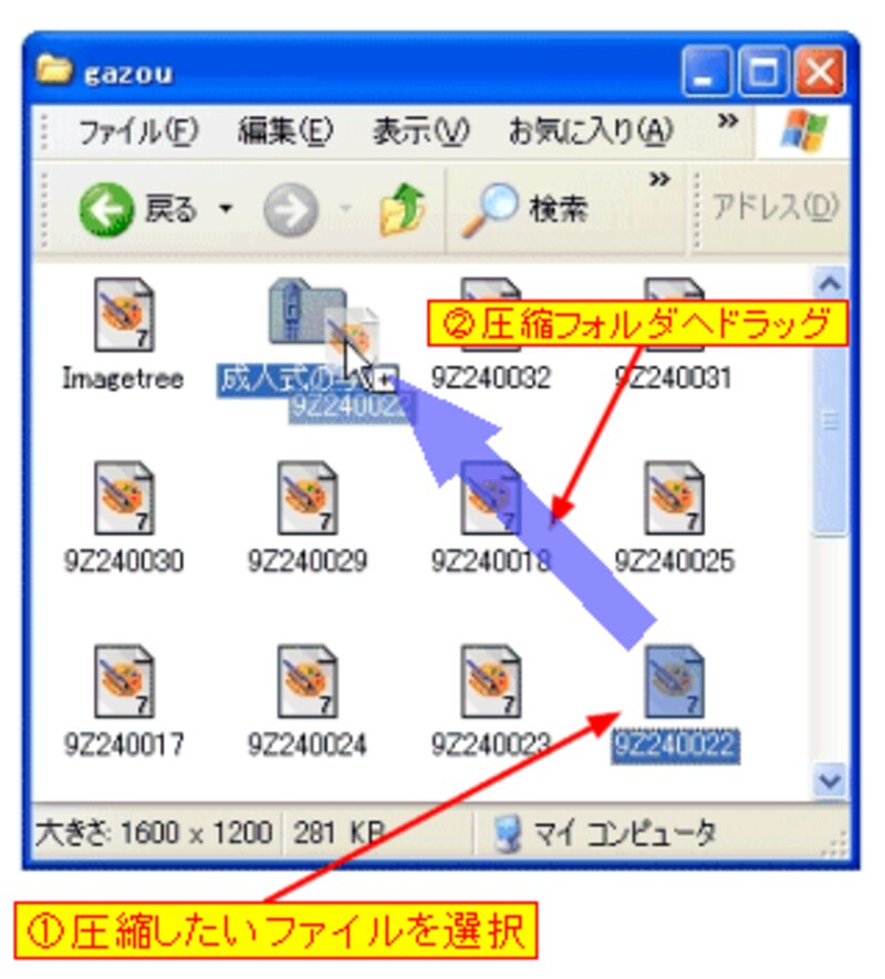 ファイルを圧縮フォルダへ移動させたい場合は、[Shift]キーを押しながらドラッグします。