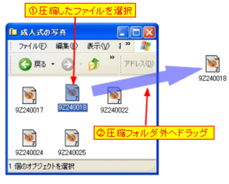 圧縮したファイルを展開するときは、圧縮フォルダの外にドラッグします。元のファイルはそのままで、ファイルのコピーが展開されます。