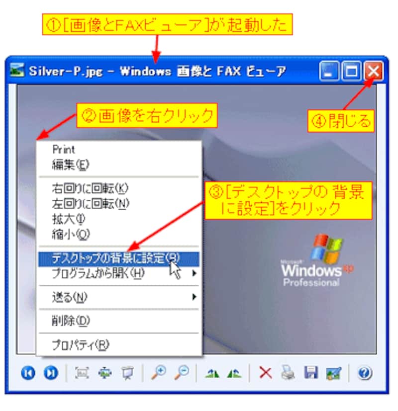 ダブルクリックすると[画像とFAXビューア]が起動しますので、画像を右クリック→[デスクトップの背景に設定]をクリックします。[画像とFAXビューア]を閉じると、壁紙が変更されているのが確認できます。