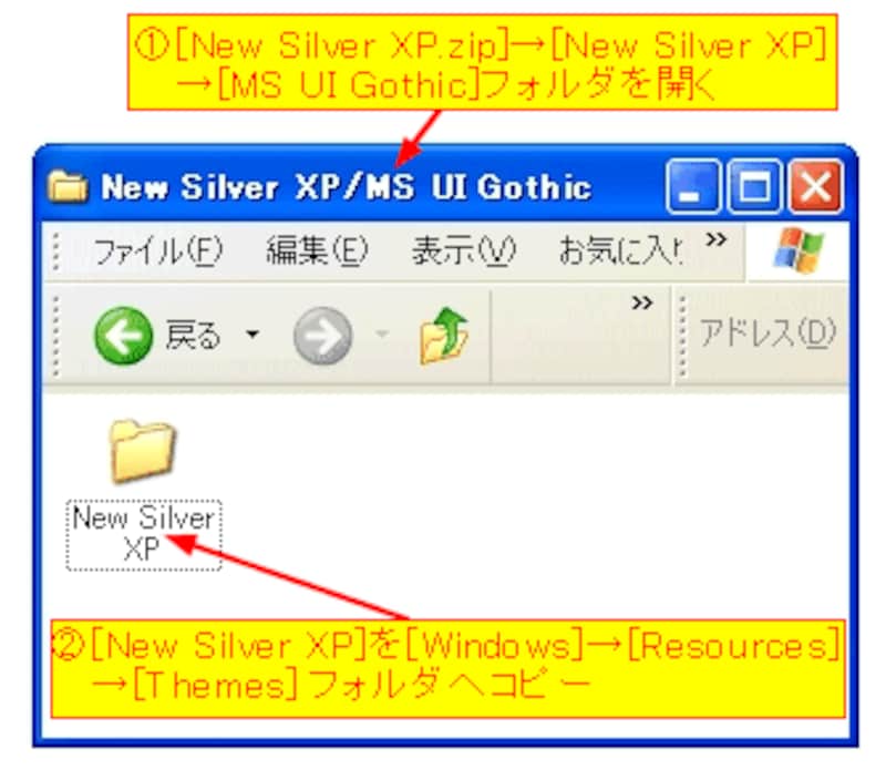 次に[New Silver XP.zip]→[New Silver XP]→[MS UI Gothic]フォルダを開きます。中に[New Silver XP]フォルダがありますので、これを[Windows]→[Resources]→[Themes]フォルダへコピーします。