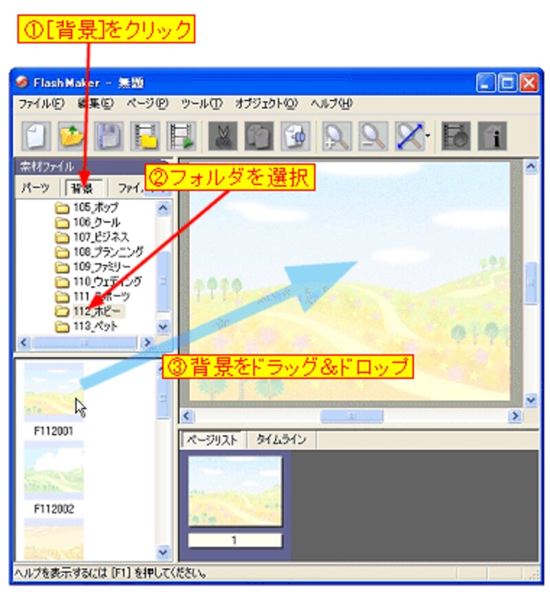 FlashMakerを起動すると、つぎのような画面が表示される。まず、素材ファイルから背景を選択して、編集ウィンドウへドラッグ&ドロップする。