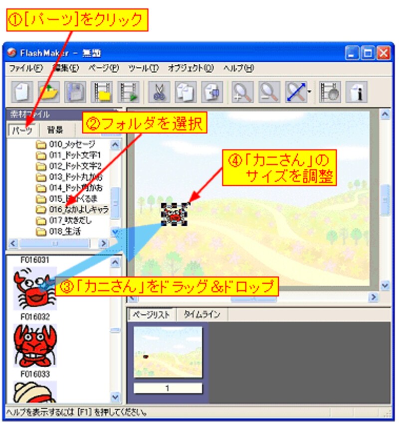 背景を設定したら、つぎに動くキャラクタを追加する。素材ファイルの[パーツ]ボタンをクリックしてキャラクタを選択し、編集ウィンドウへドラッグ&ドロップする。ここでは「カニさん」を指定した。