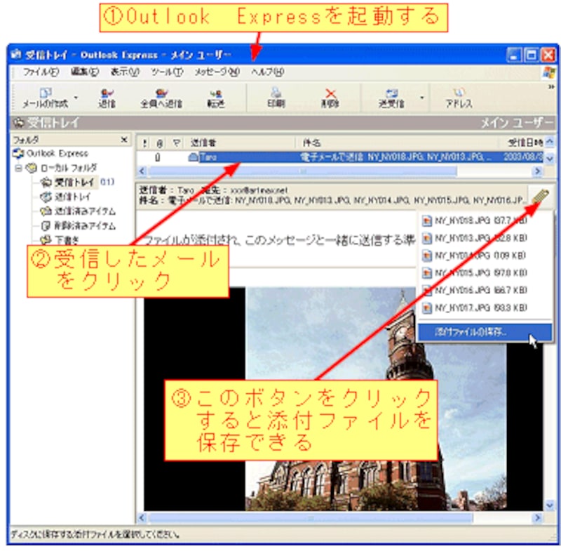 Outlook Expressを起動後、受信したメールを選択するとプレビューウィンドウに写真が表示されます。右側にある[クリップ]ボタンをクリックすると、添付ファイルを指定したフォルダに保存できます。