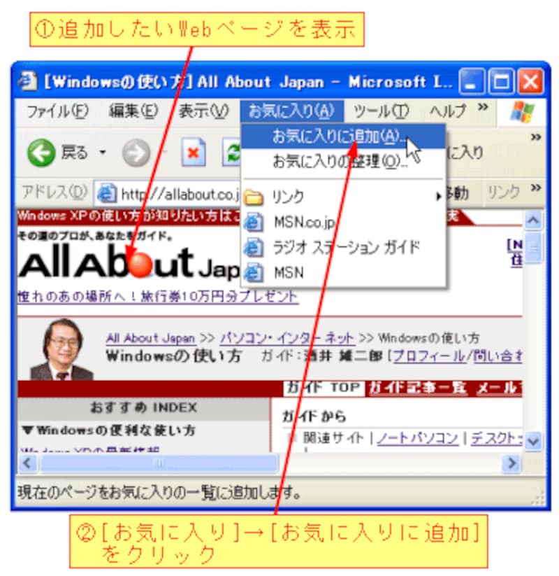 まず、Internet Explorerに追加したいWebページを表示します。そして、[お気に入り]メニュー→[お気に入りに追加]をクリックします。