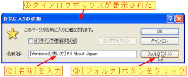 [お気に入りに追加]をクリックすると、次のダイアログボックスが表示されます。通常、[名前]ボックスにはWebページのタイトルが自動的に入力されていますが、より適切な名前にしたいときはキーボードから入力します。