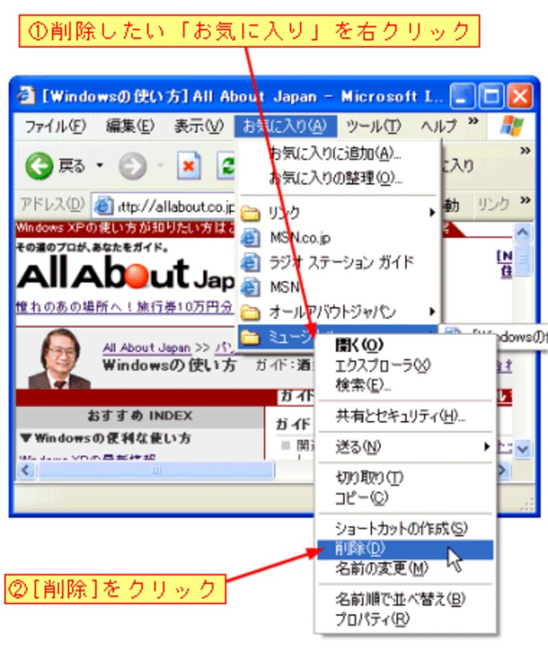リンク切れや必要なくなった「お気に入り」は、ドンドン削除しましょう。削除したい「お気に入り」を右クリックし、ショートカットメニューが表示されたら、[削除]をクリックします。