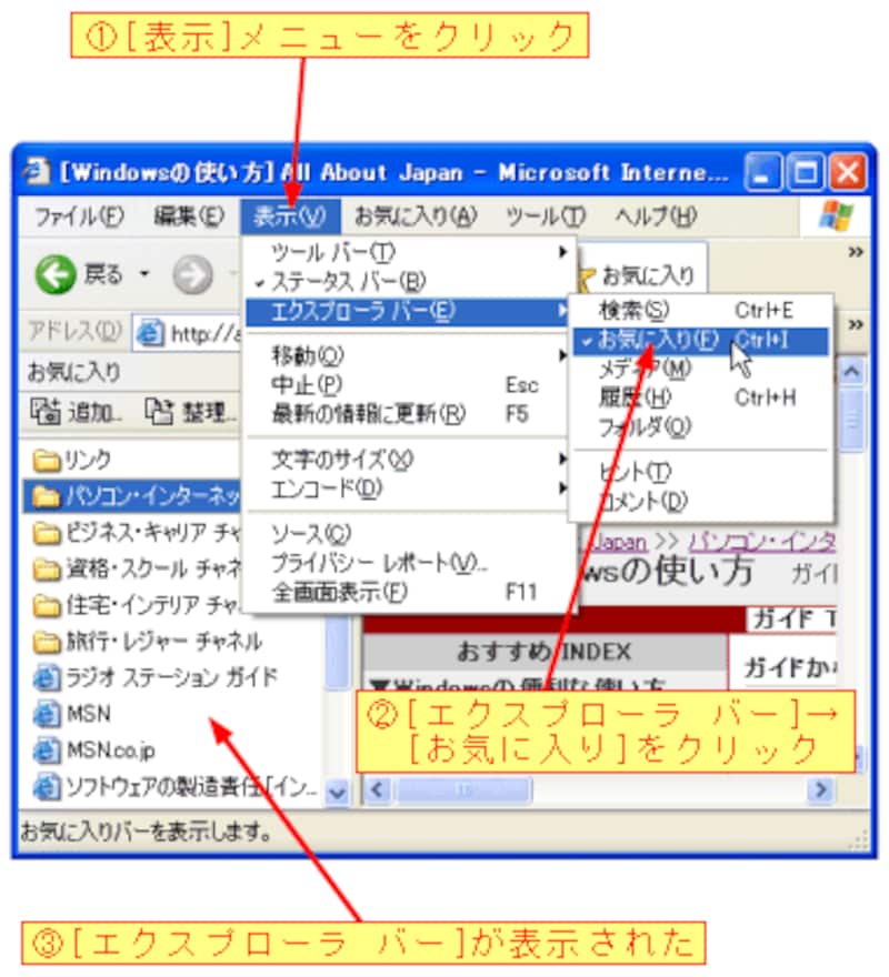[お気に入り]エクスプローラ バーを表示するには、まず、[お気に入り]メニューをクリックします。メニューが表示されたら、[エクスプローラ バー]→[お気に入り]をクリックします。