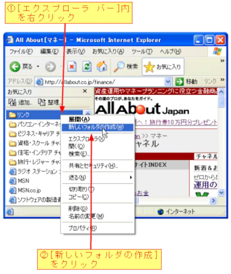 カテゴリ別にフォルダを作ると、「お気に入り」を効率的に整理できます。[エクスプローラ バー]内を右クリックすると、ショートカットメニューが表示されますので、[新しいフォルダの作成]をクリックします。新しいフォルダができたら名前を入力します。