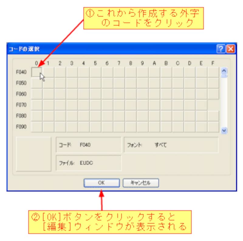 外字エディタが起動すると、[コード選択]ダイアログボックスが表示されますので、これから作成する外字のコードを割り当てます。
