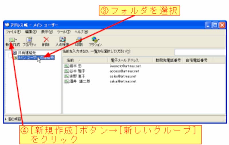 まず、Outlook Expressのアドレス帳に新しいグループを作成します。アドレス帳に登録済みの連絡先であれば、グループのメンバーに簡単に追加できます。