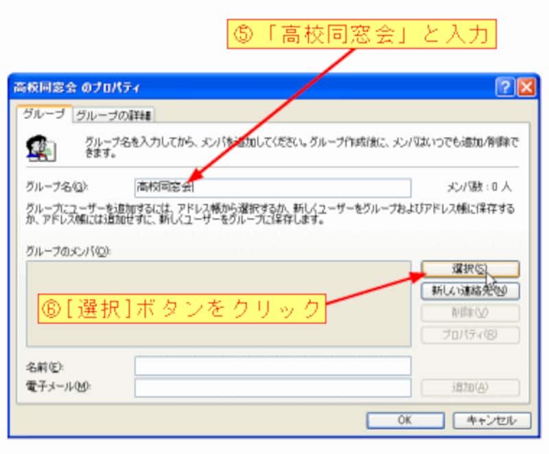 [新しいグループ]をクリックすると、[プロパティ]ダイアログボックスが表示されますので、[グループ名]ボックスに新しいグループ名を入力します。ここでは高校同窓会というグループ名にしました。