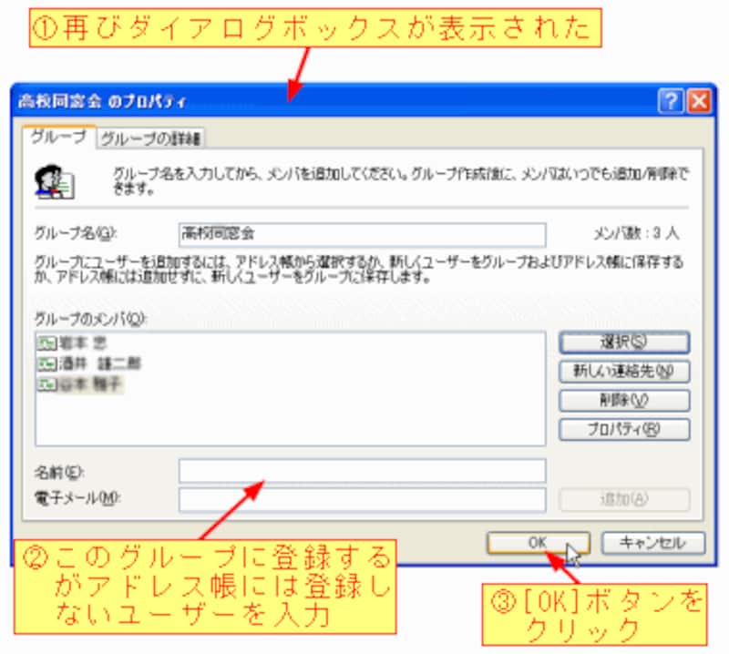 [OK]ボタンをクリックすると、再び[高校同窓会のプロパティ]ダイアログボックスに戻ります。アドレス帳には登録しないで、グループのみに登録したいユーザーについては、一番下にある[名前]ボックスと[電子メール]ボックスに連絡先を入力します。