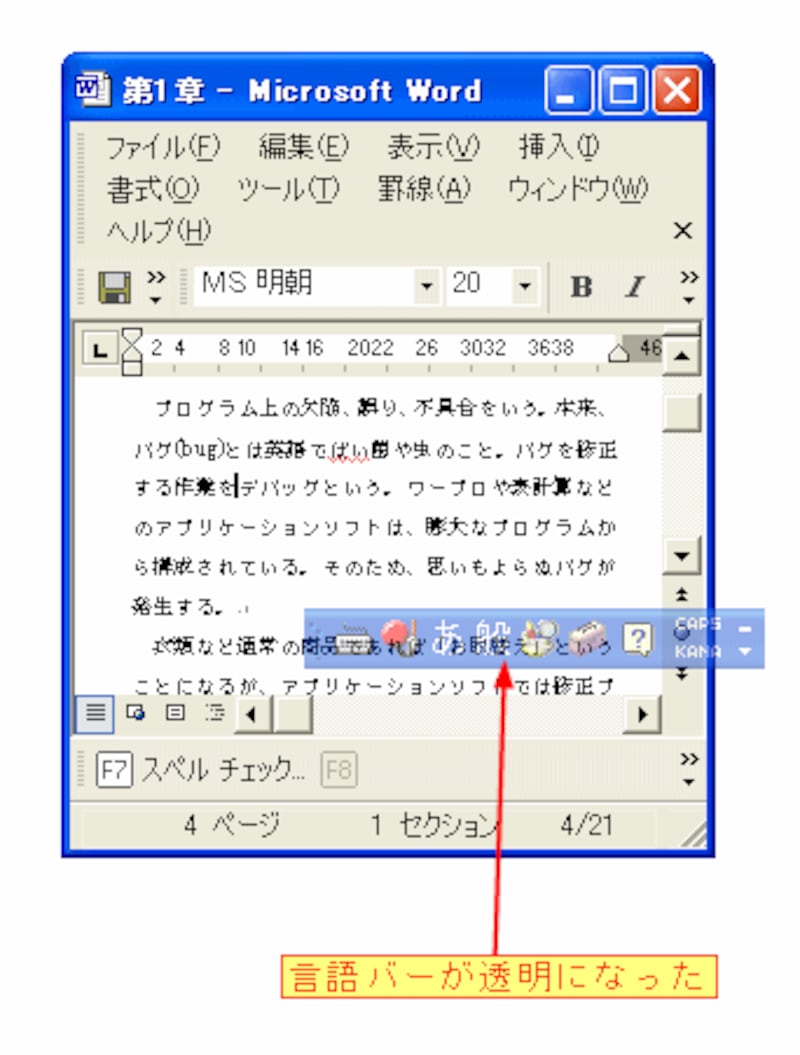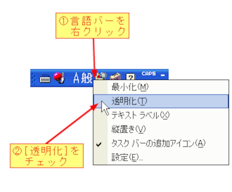 言語バーの「影」をうすくして透けて見えるように設定します。マウスポインタを言語バーに移動すると一時的に透明化が解除されます。まず、言語バーを右クリックして、[透明化]を選択します。