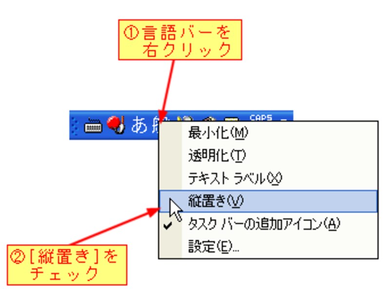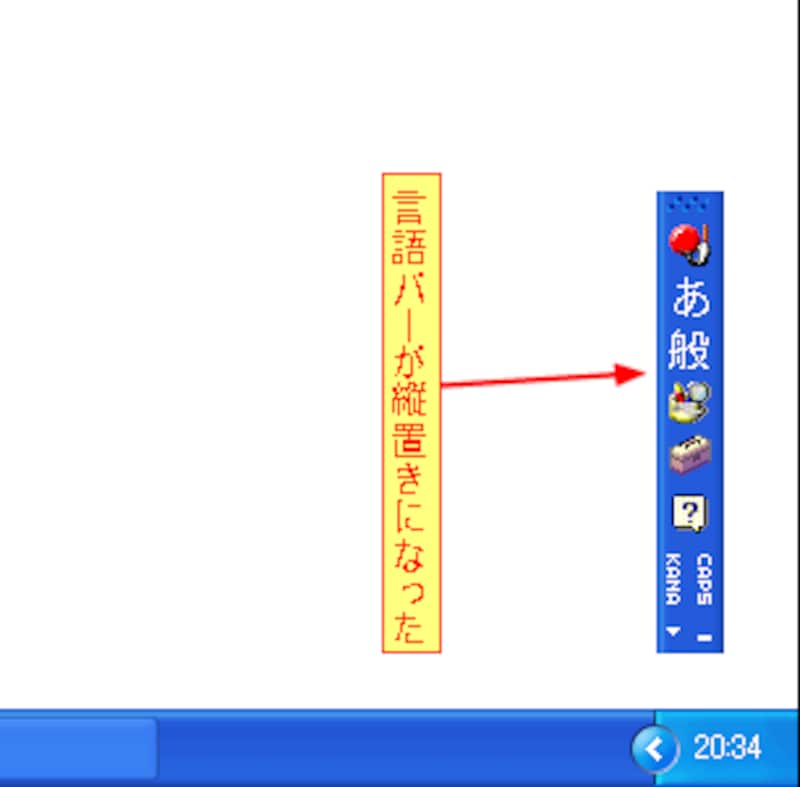 言語バー元の状態に戻すときは、言語バーを右クリック→[縦置き]のチェックを解除します。