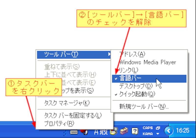 まず、タスクバーの空いている部分を右クリックします。メニューが表示されたら、[ツールバー]→[言語バー]のチェックを解除します。