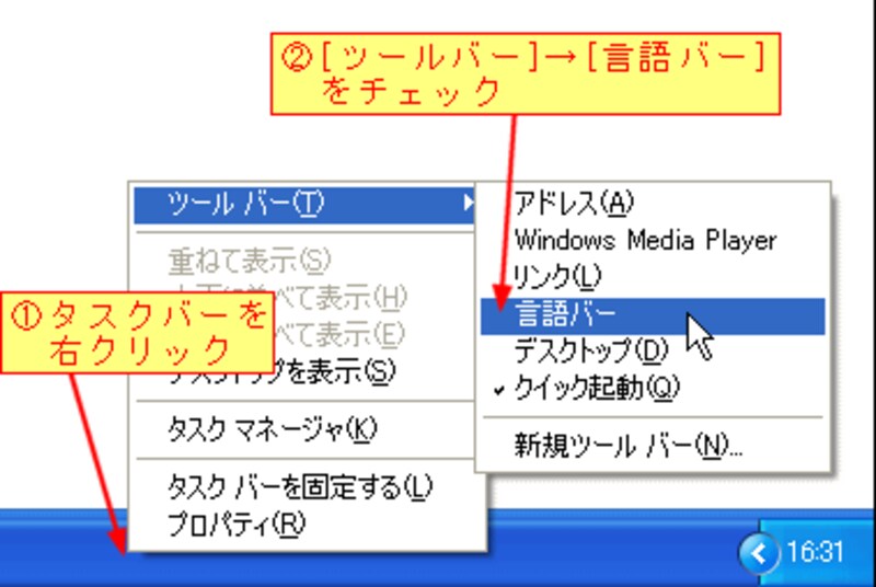 タスクバーの言語アイコンをもう一度表示させるときは、タスクバーを右クリック→[ツールバー]をポイントして、[言語バー]をチェックします。