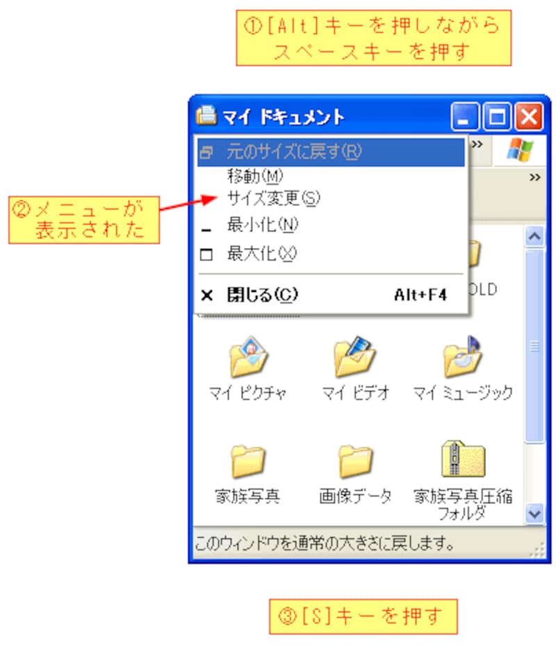 まず、[Alt]キーを押しながらスペースキーを押します。メニューが表示されたら[S]キーを押します。