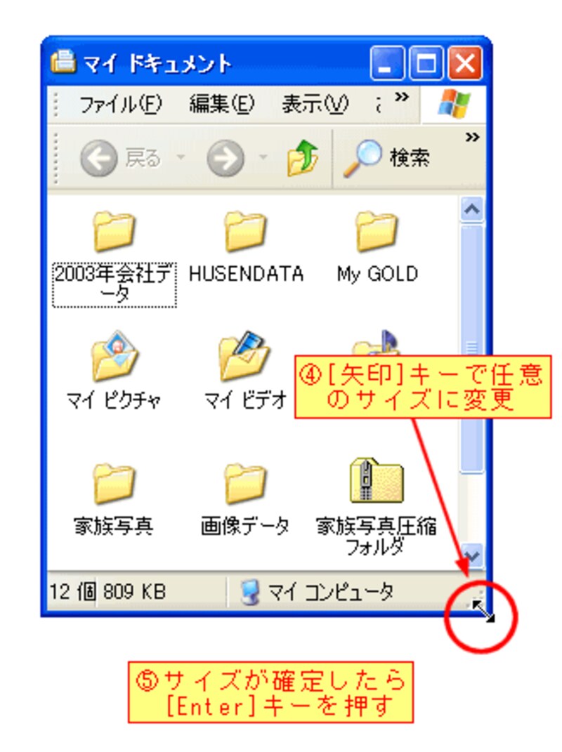 これで、キーボードでウィンドウサイズを変更できるようになりました。矢印キーを使い任意のサイズに変更します。サイズが確定したら[Enter]キーを押します。