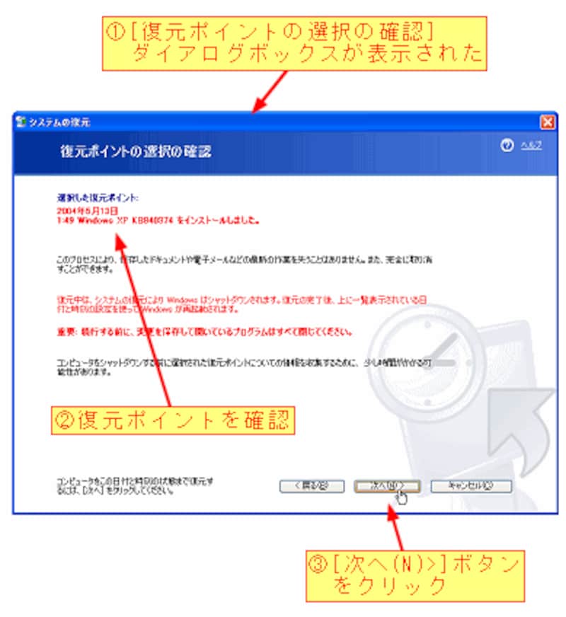 [次へ(N)>]ボタンをクリックすると、[復元ポイントの選択の確認]ダイアログボックスが表示されます。