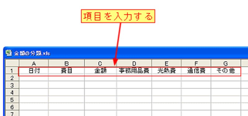 IF関数の「働き」を確かめるため、試しに簡単な経費明細表を作ってみましょう。項目は、A列に「日付」、B列に「費目」、C列に「金額」、D列に「事務用品費」、E列に「光熱費」、F列に「通信費」、G列に「その他」と入力します。