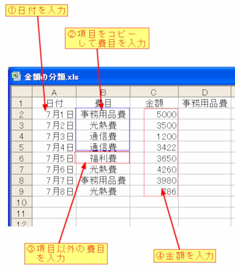 続いて、日付、費目、金額を入力します。費目は項目を[Ctrl]+[C]でコピーし、[Ctrl]+[V]で貼り付けて入力してください。また、「その他」に分類されるように、「事務用品費」、「光熱費」、「通信費」以外の費目、たとえば「福利費」、「慶弔費」などを手入力してください。