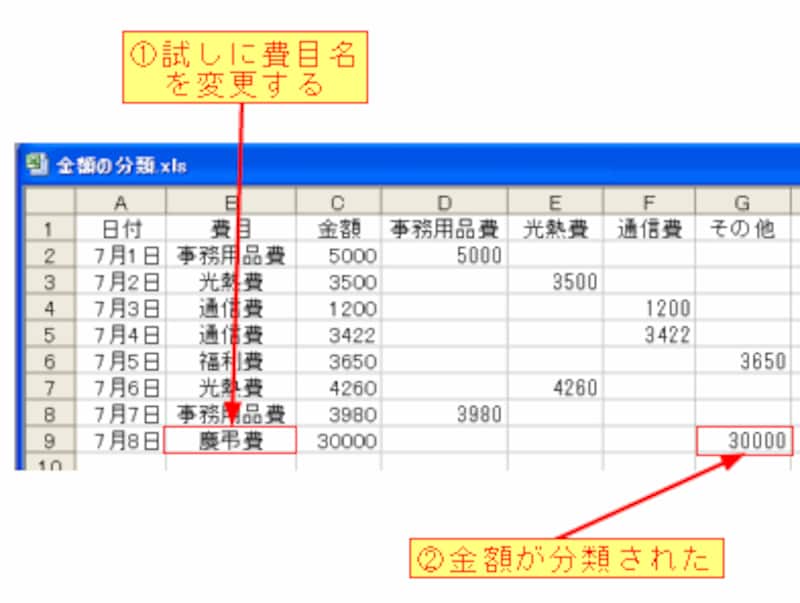 試しに費目名を変更してみてください。正しい列に分類されたでしょうか?