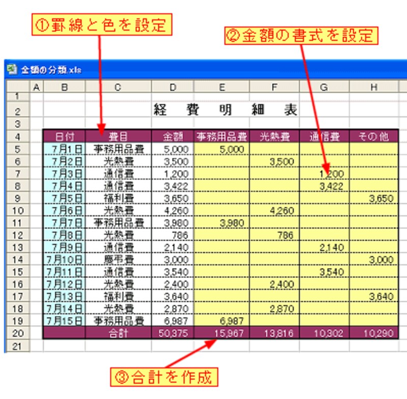 最後に罫線と色を設定して、見栄えのよい経費明細表にします。金額が表示される欄は[セルの表示形式]を[数値]にし、3桁おきにカンマで区切るようにしました。