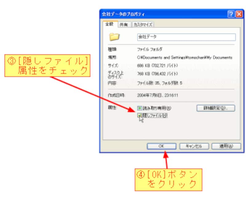 3)[隠しファイル]属性をチェックする。