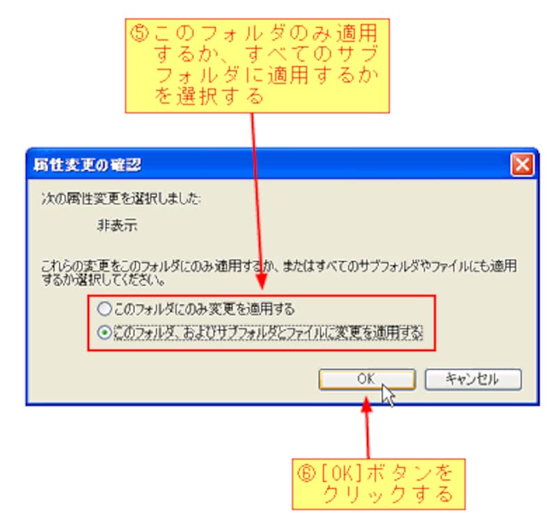 [OK]ボタンをクリックすると、[属性変更の確認]ダイアログボックスが表示されます。ここで、属性変更をこのフォルダのみ適用するか、すべてのサブフォルダやファイルに適用するかを選択します。