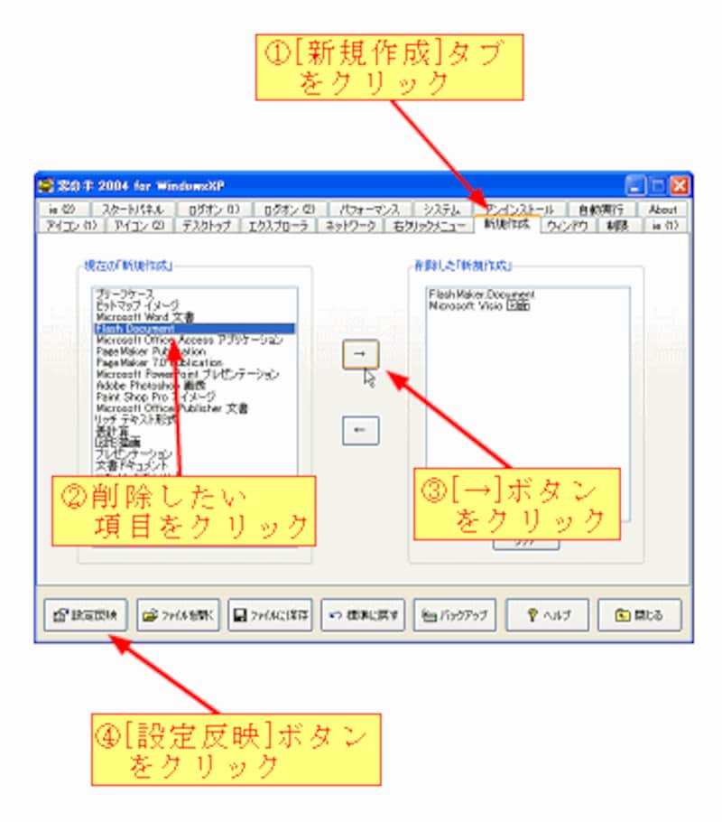 この際、不必要な項目は削除して、元の快適さを取り戻しましょう。[新規作成]タブをクリックすると、左側のボックスに現在のメニュー項目が表示されますので、削除したいメニュー項目をクリックしてから、[→]ボタンをクリックします。右側のボックスに削除したメニュー項目が表示されますので、確認後に[設定反映]ボタンをクリックします。