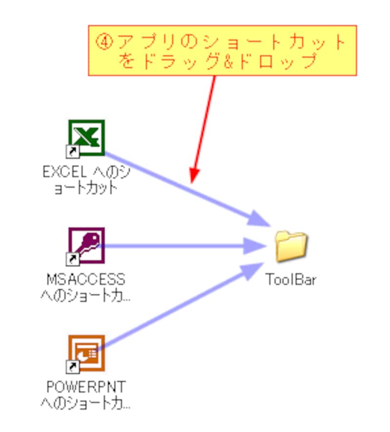 フォルダに普段使っているアプリケーションのショートカットを集めてツールバーとして表示すると、ちょっとしたアプリ起動ランチャーが出来上がります。